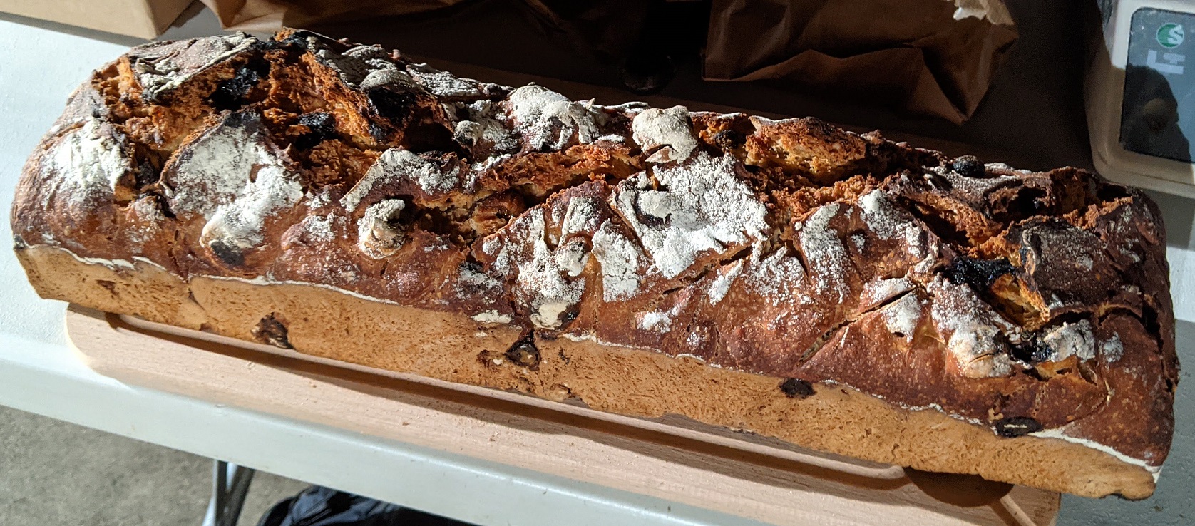 Ingrédients : farine de blés anciens*, eau filtrée, sel de Salies de Béarn, levain de blé et seigle*, noisettes*, figues séchées*, abricots secs*, raisins secs*